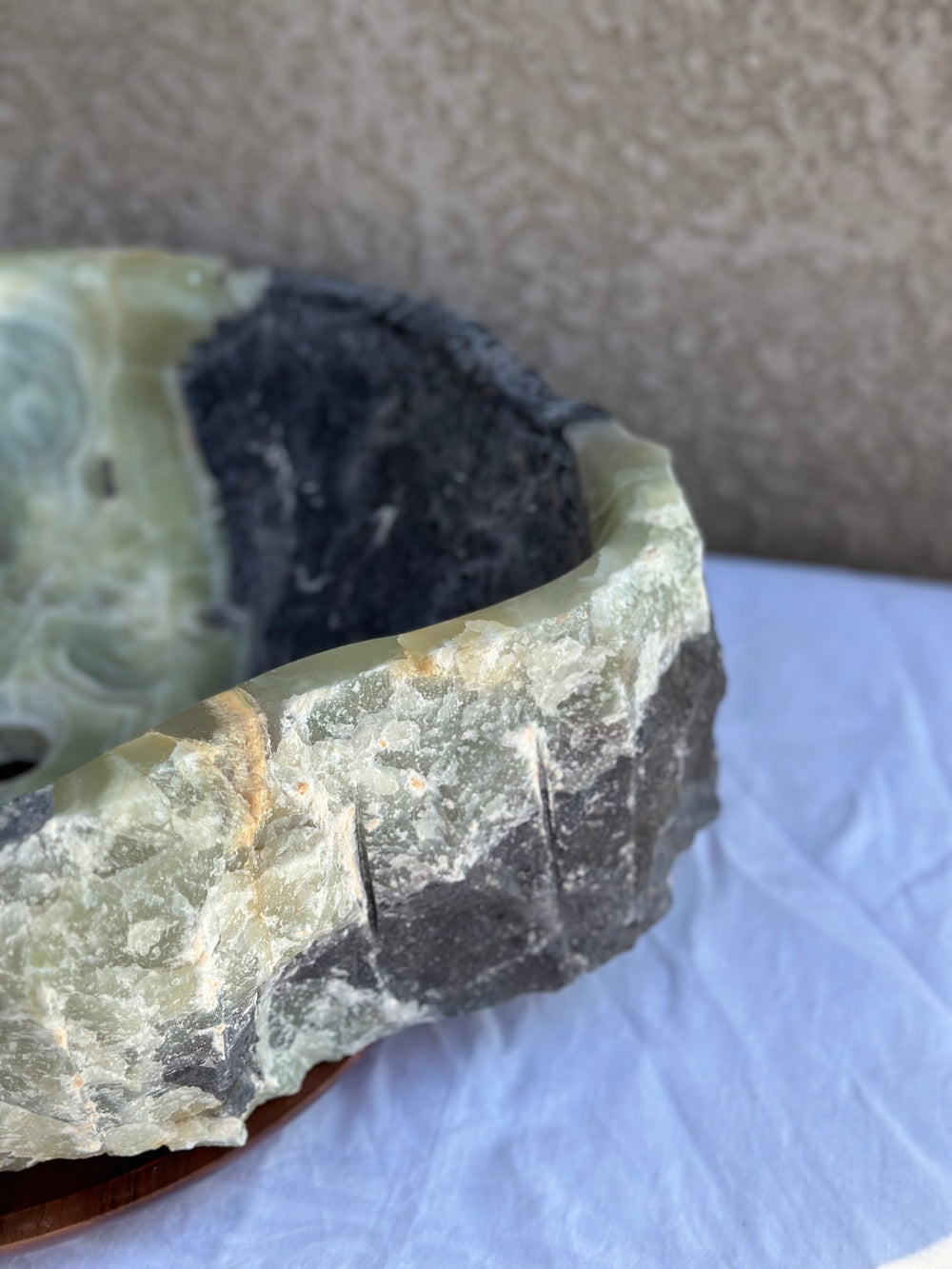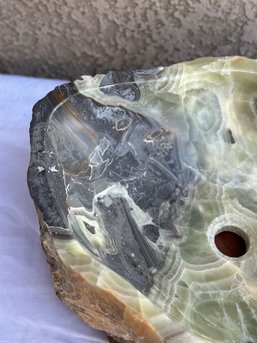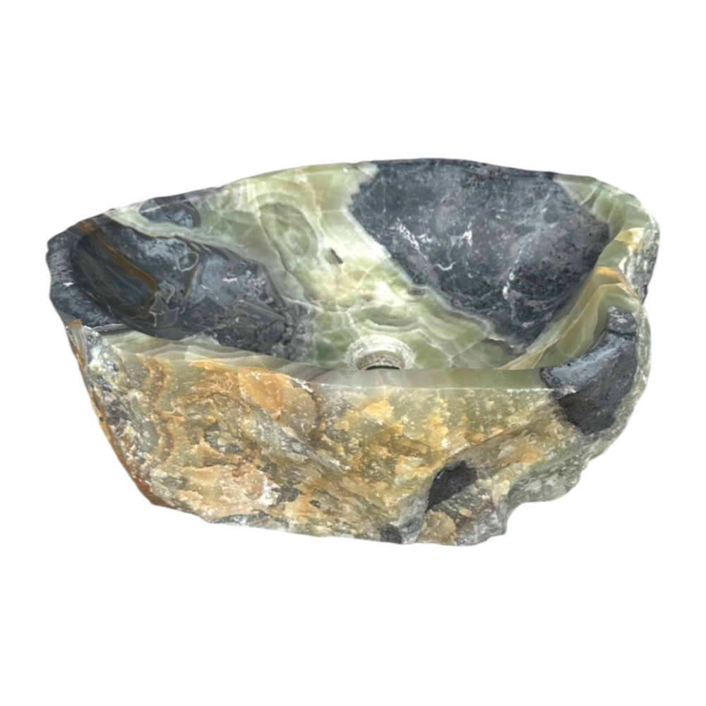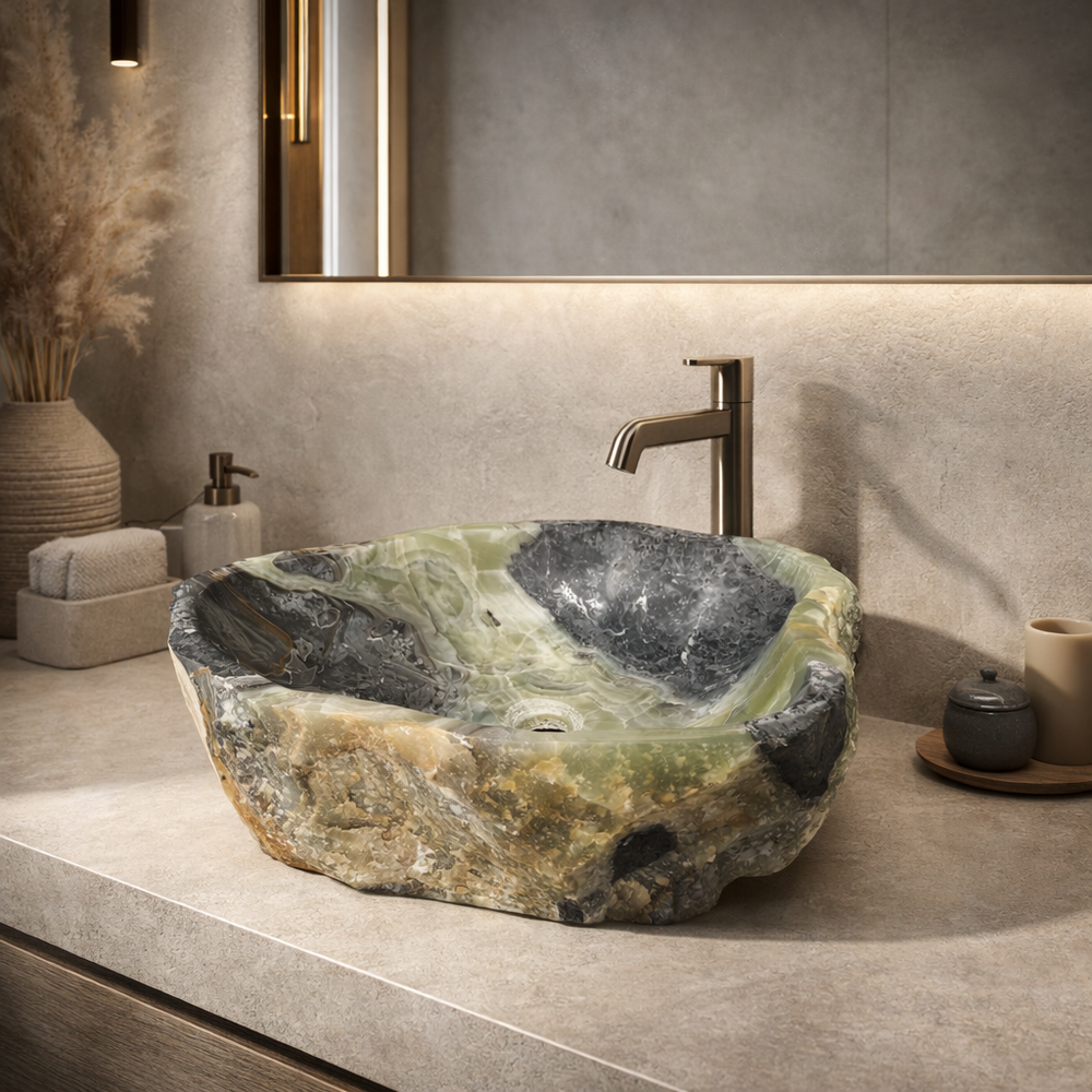 Este lavabo de vasija único está tallado a mano a partir de un único bloque sólido de ónix natural, con vetas dramáticas y texturas orgánicas irrepetibles. Cada superficie realza la belleza natural de la piedra, mientras que el interior está cuidadosamente moldeado para el uso diario.