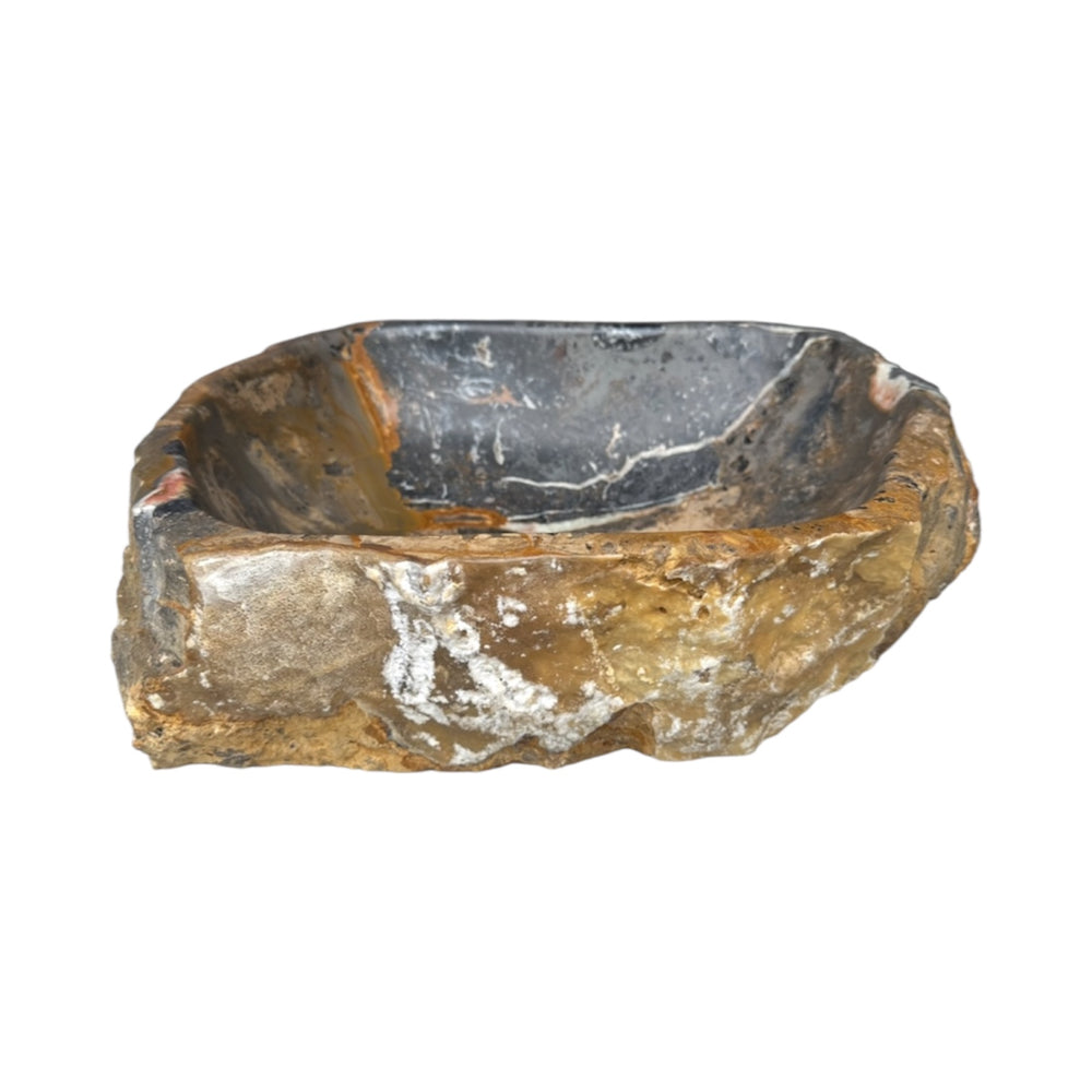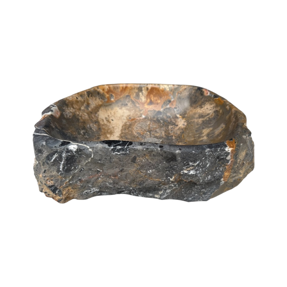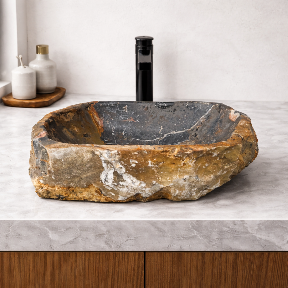 Este lavabo de vasija único está tallado a mano a partir de un único bloque sólido de ónix natural, con vetas dramáticas y texturas orgánicas irrepetibles. Cada superficie realza la belleza natural de la piedra, mientras que el interior está cuidadosamente moldeado para el uso diario.