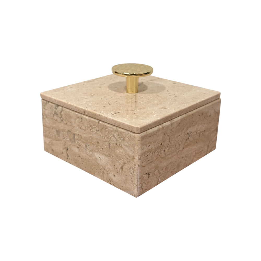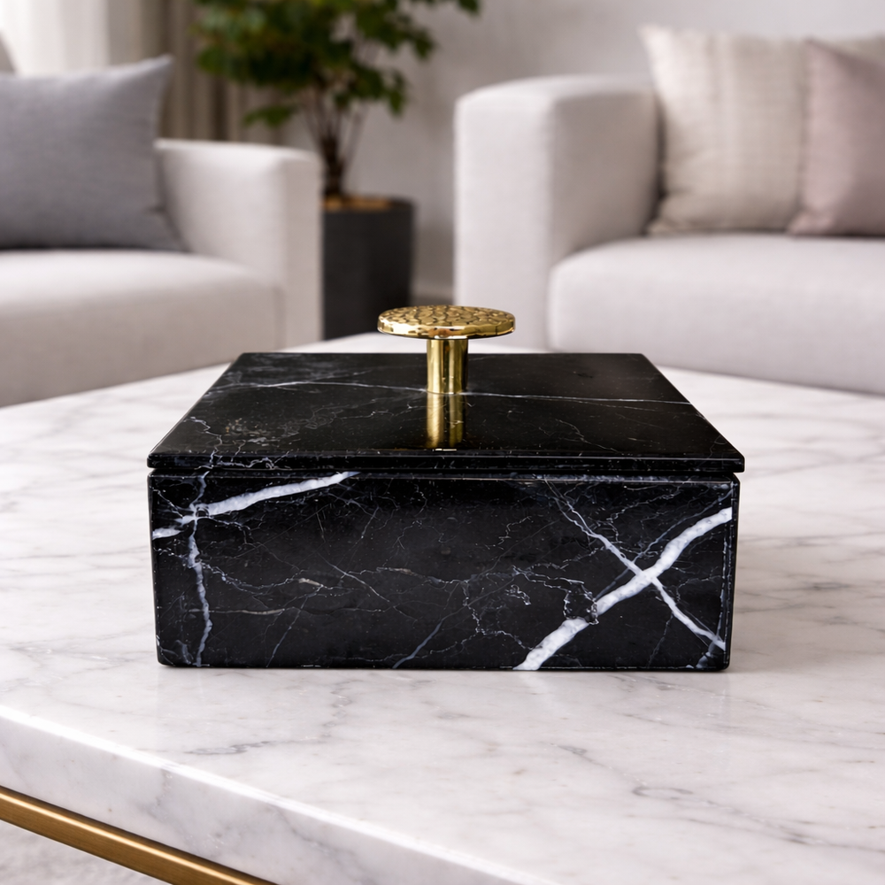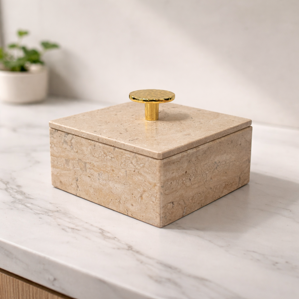 Mantén tus joyas favoritas perfectamente organizadas con este elegante joyero de mármol, elaborado artesanalmente con una forma cuadrada atemporal y rematado con un llamativo pomo redondo dorado. Funcional y decorativo a la vez, es perfecto para guardar anillos, pendientes o pequeños recuerdos.