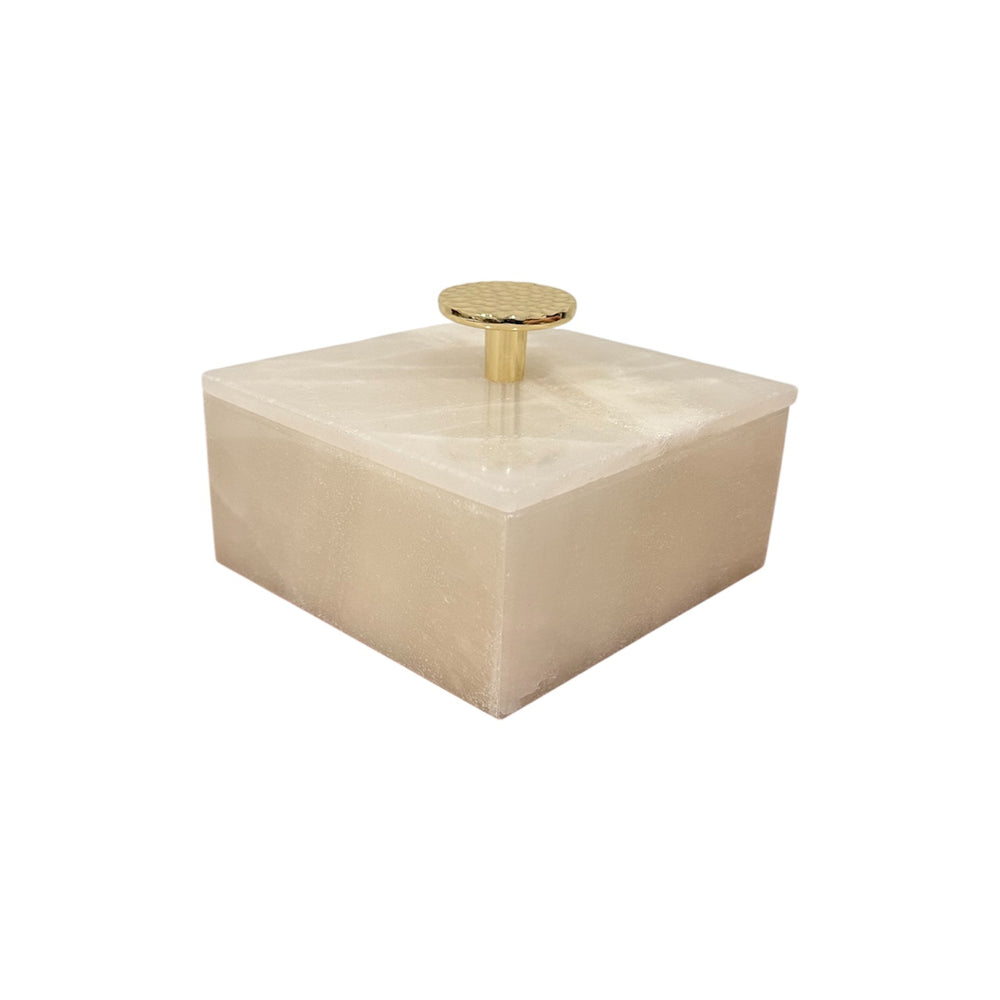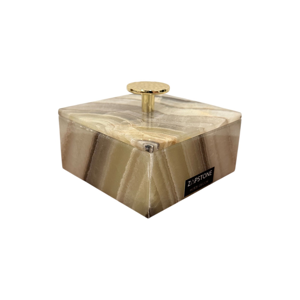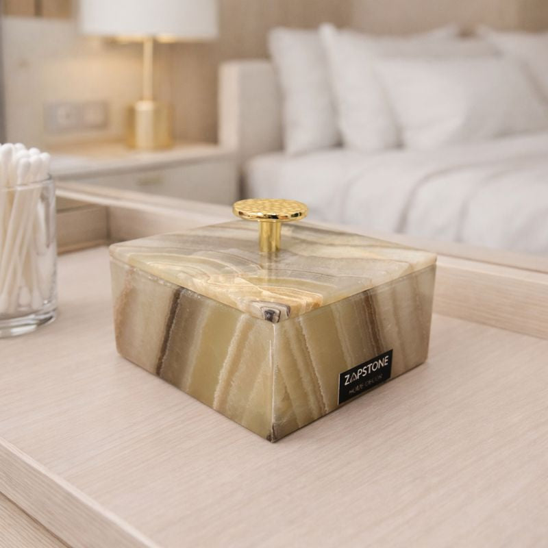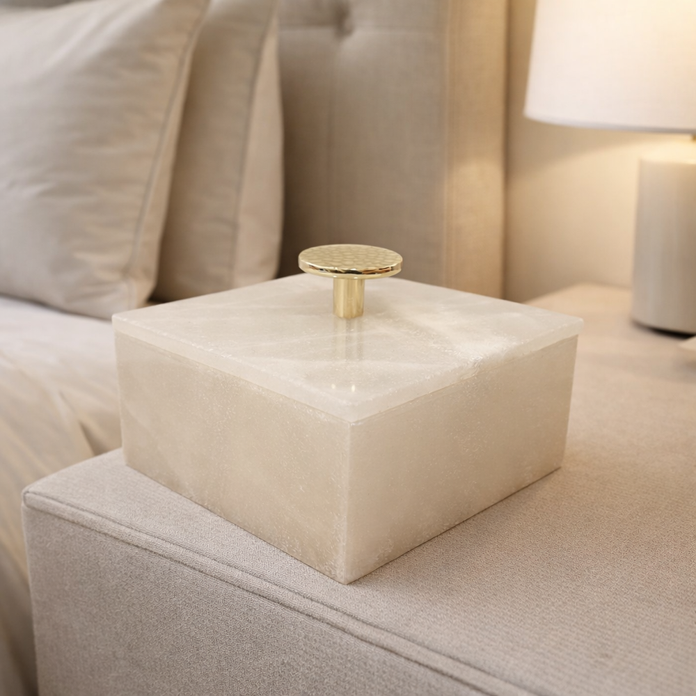Mantén tus joyas favoritas perfectamente organizadas con este elegante joyero de mármol, elaborado artesanalmente con una forma cuadrada atemporal y rematado con un llamativo pomo redondo dorado. Funcional y decorativo a la vez, es perfecto para guardar anillos, pendientes o pequeños recuerdos.
