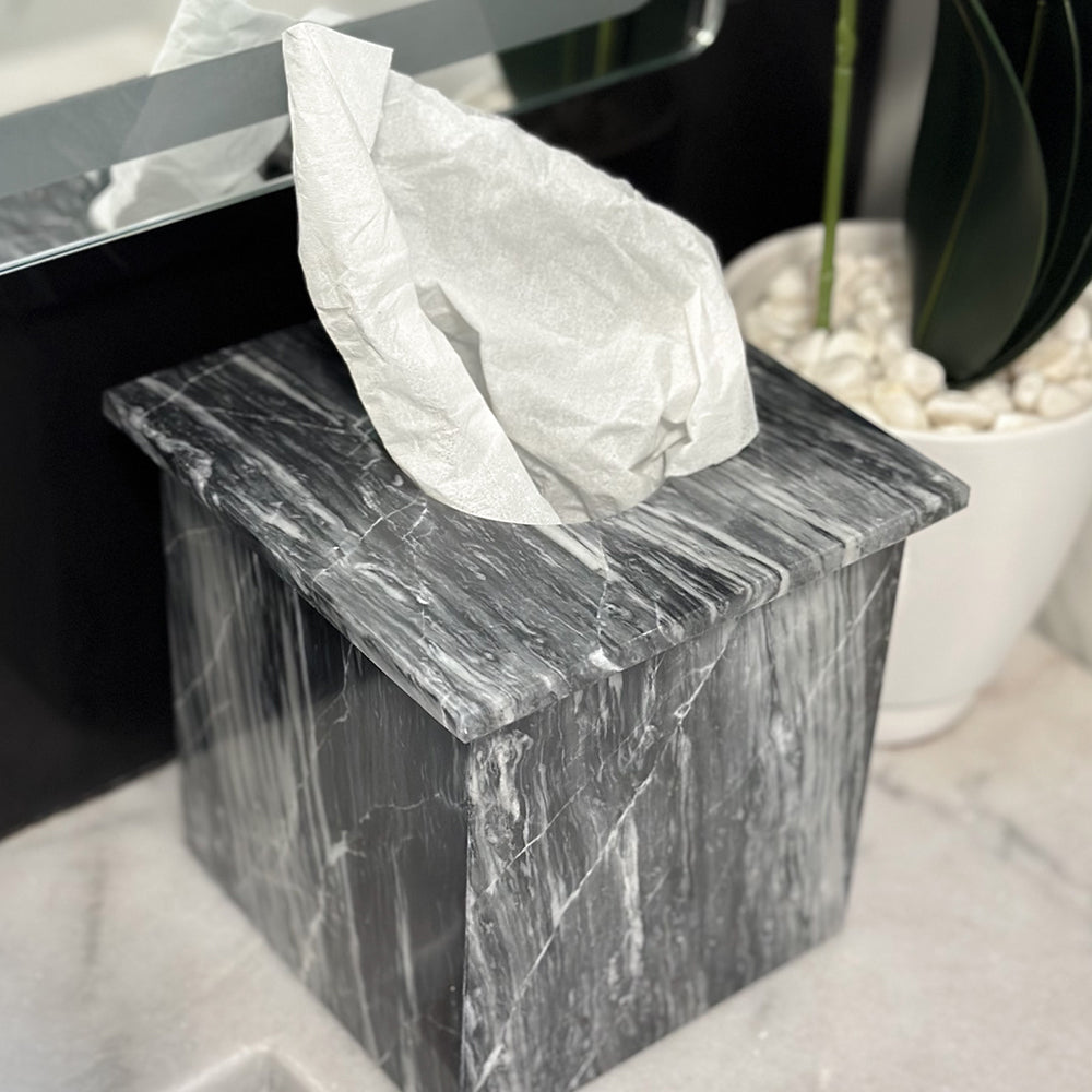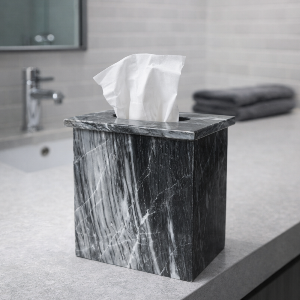 Transforma tu espacio con nuestra caja de pañuelos cuadrada de mármol, con tapa extraíble para un acceso cómodo y una estética impecable. Hecha a mano con piedra natural, cada pieza luce vetas distintivas y un acabado suave y pulido.