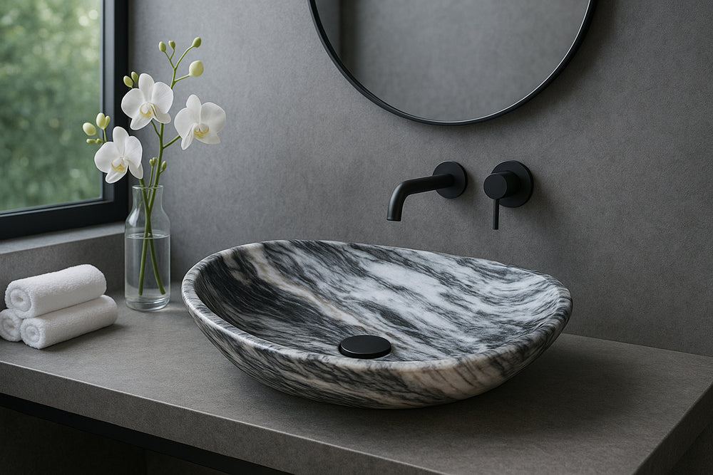 Elevate your bathroom with the understated sophistication of the Gris Masahua vessel sink—a soft, smoky grey tone with natural veining that evokes modern elegance while celebrating the organic beauty of marble. Hand-carved from a single block of premium marble, each sink is entirely unique, showcasing patterns and textures formed by nature over millennia.