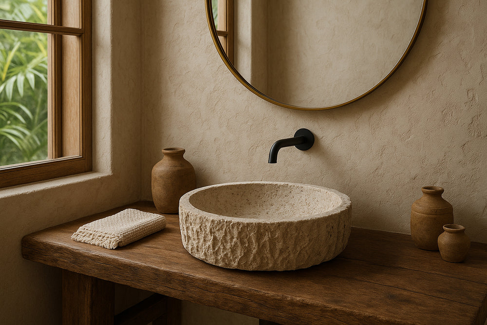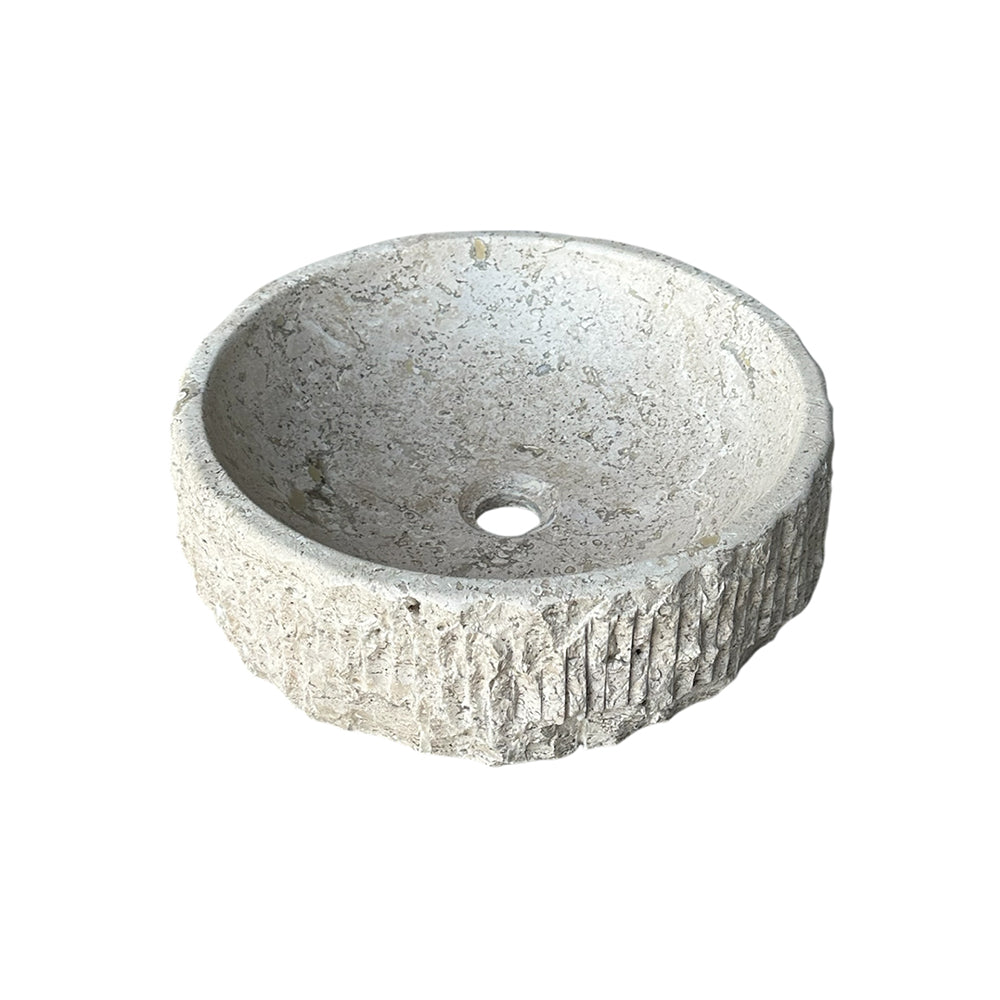 Striking a perfect balance between rustic charm and refined luxury, this round vessel sink features a polished interior for smooth elegance and a naturally textured exterior that celebrates the raw beauty of stone. Hand-carved from solid travertine, each piece is unique, showcasing the organic patterns that only natural stone can provide.