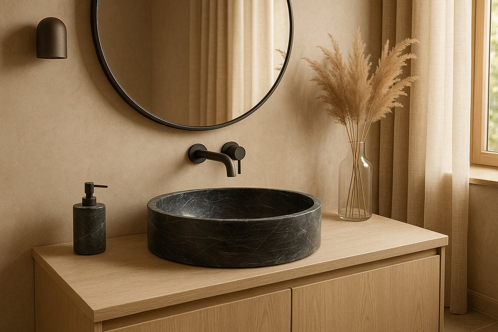 Bring quiet sophistication to your bathroom with this round vessel sink in Gris Masahua, a soft, smoky grey marble with subtle, natural veining. Polished inside and out, it captures light beautifully, creating a serene and luxurious centerpiece.