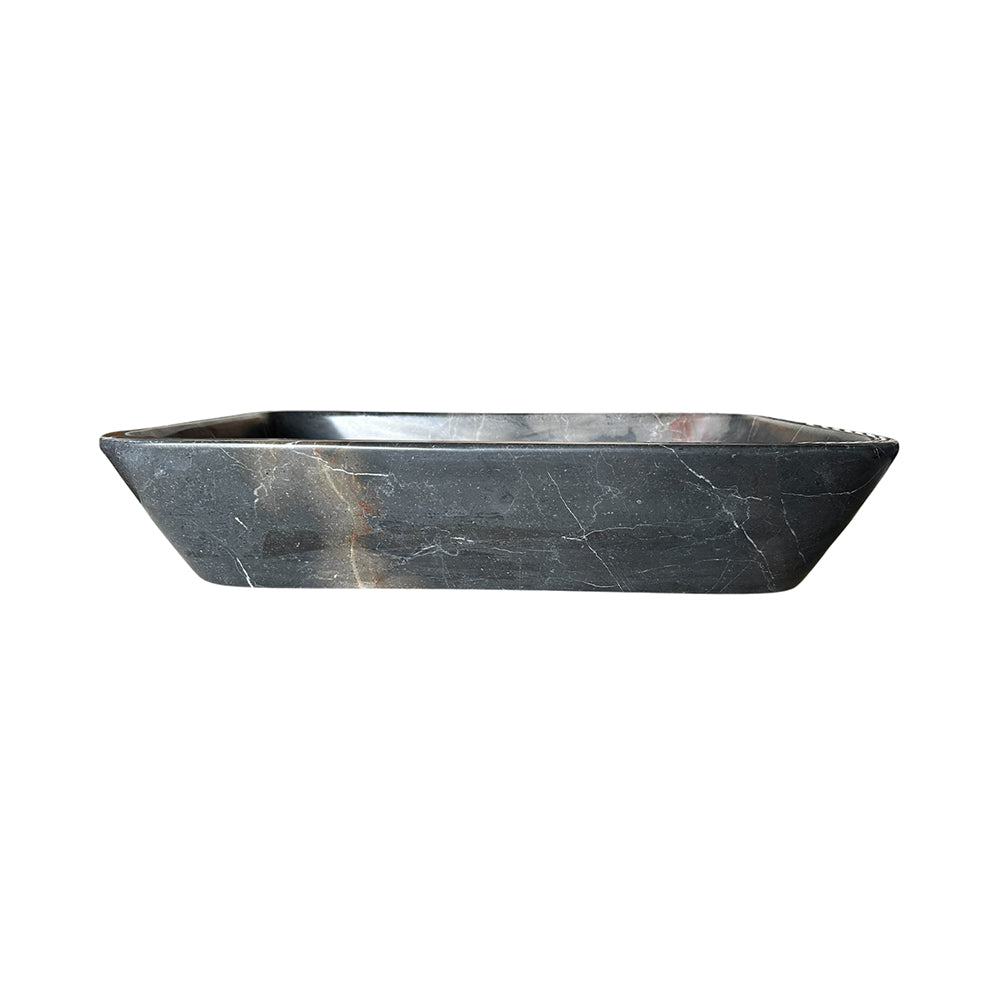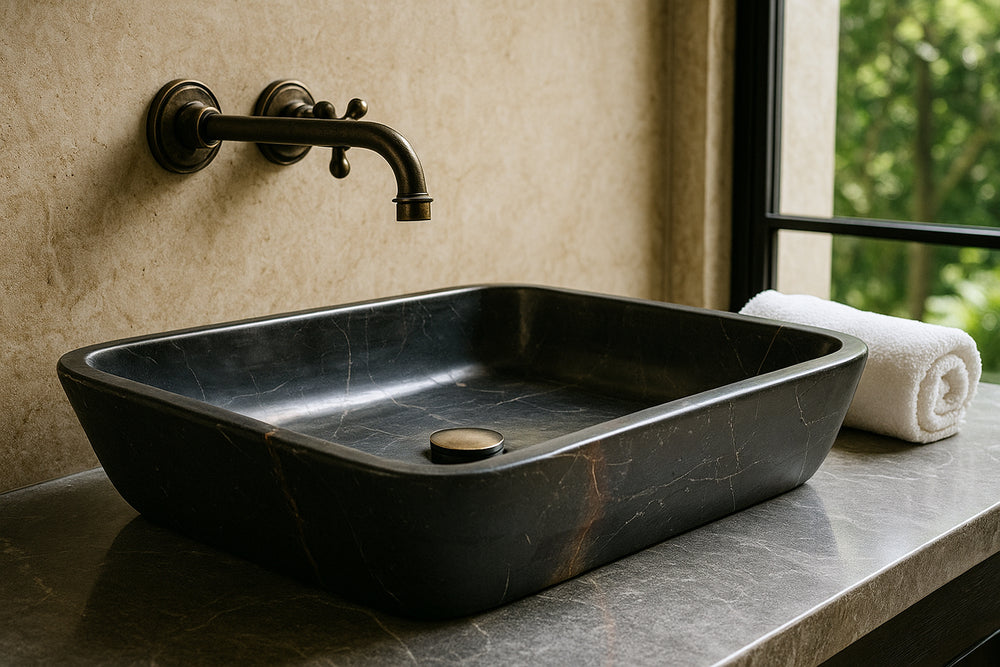 Command attention with this expansive black marble vessel sink, a bold statement piece for any luxury bathroom. Its deep, polished surface showcases natural white veining, creating dramatic contrast and unmatched sophistication.