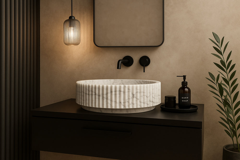 Graceful, modern, and timeless — this handcrafted white marble vessel sink transforms everyday routines into moments of quiet luxury. With its perfectly round form and vertical carved lines running from top to bottom, it captures the artistry of fine stonework and the serene beauty of natural marble.