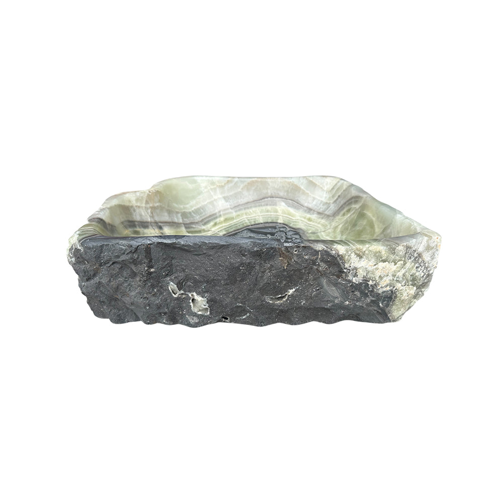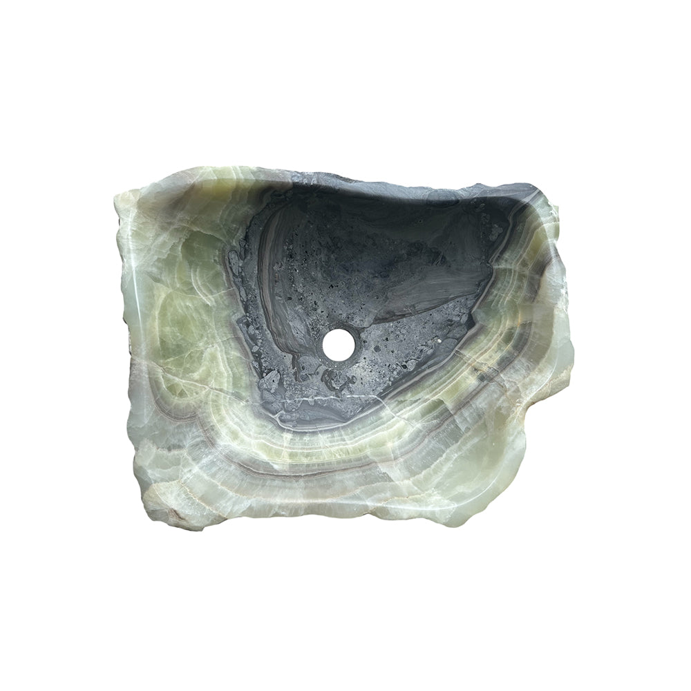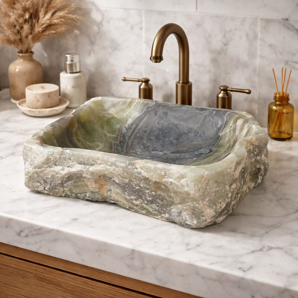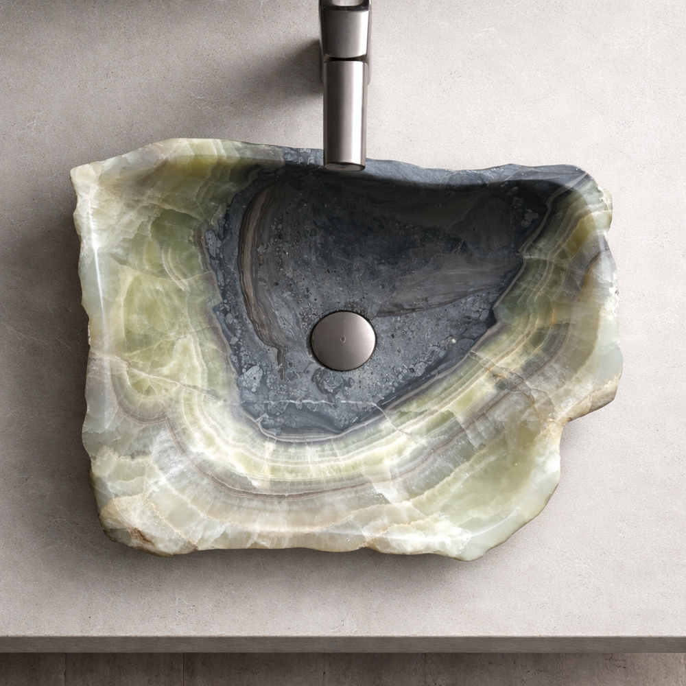 This one-of-a-kind vessel sink is hand carved from a single solid block of natural onyx, showcasing dramatic veining and organic textures that cannot be replicated. Each surface highlights the raw beauty of the stone while the interior is carefully shaped for everyday use.