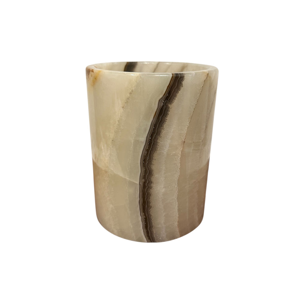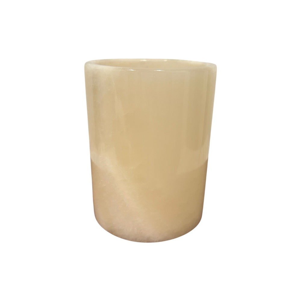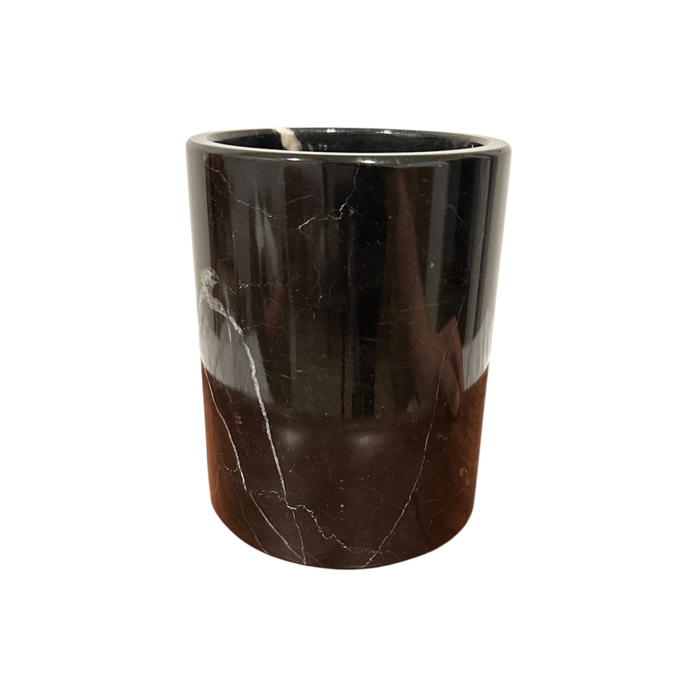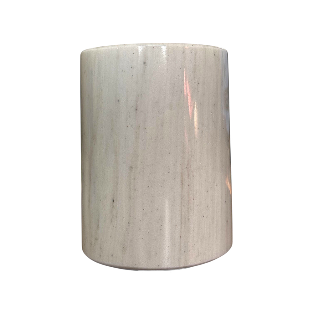 A statement of simplicity and sophistication, this handcrafted white marble vessel effortlessly blends form and function. Whether used as a utensil holder in the kitchen or a flower vase in a living space, its cool, polished surface and natural veining bring a touch of refined luxury to any setting.